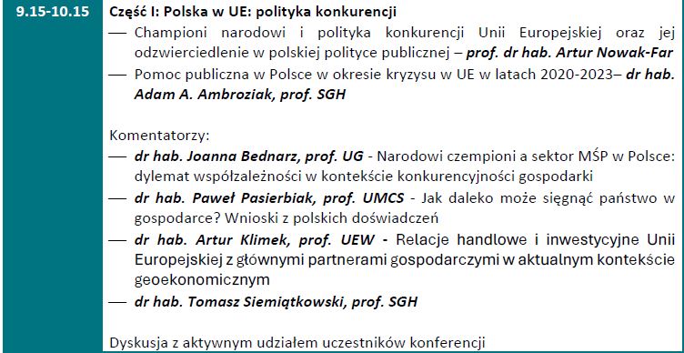 Prof. Joanna Bednarz took part as a discussant in the first session of the conference entitled “Poland in the EU: Competition Policy” and delivered a presentation on “National Champions and the SME Sector in Poland: The Dilemma of Interdependence in the Context of Economic Competitiveness”.