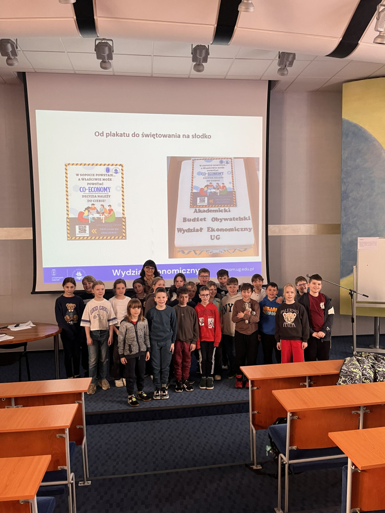 16 kwietnia 2026 r. na Wydziale Ekonomicznym Uniwersytetu Gdańskiego odbyło się wydarzenie „Mali Odkrywcy Ekonomii”, w którym uczestniczyła klasa 3A ze Szkoły Podstawowej nr 43 w Gdańsku. Spotkanie było nie tylko wartościową inicjatywą edukacyjną, lecz także wyrazem konsekwentnej realizacji strategicznych założeń Wydziału Ekonomicznego UG w obszarze współpracy z otoczeniem społeczno-gospodarczym, popularyzacji wiedzy oraz budowania relacji z lokalną społecznością.